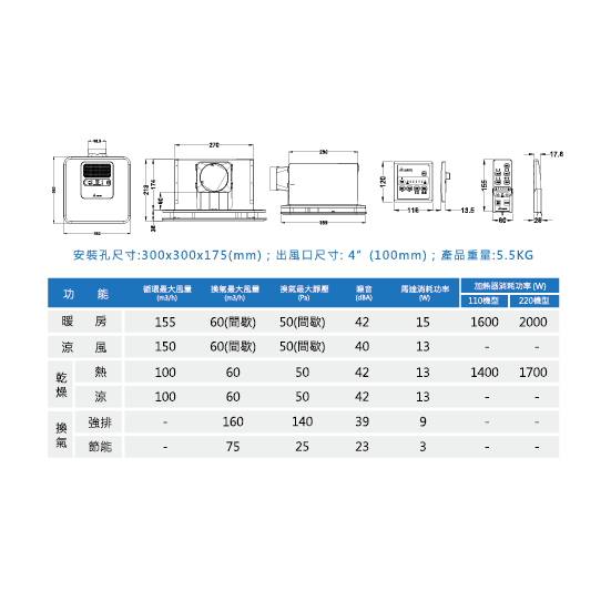 暖房15W/涼風15W/乾燥(熱/涼)13W/換氣強排9W節能3W