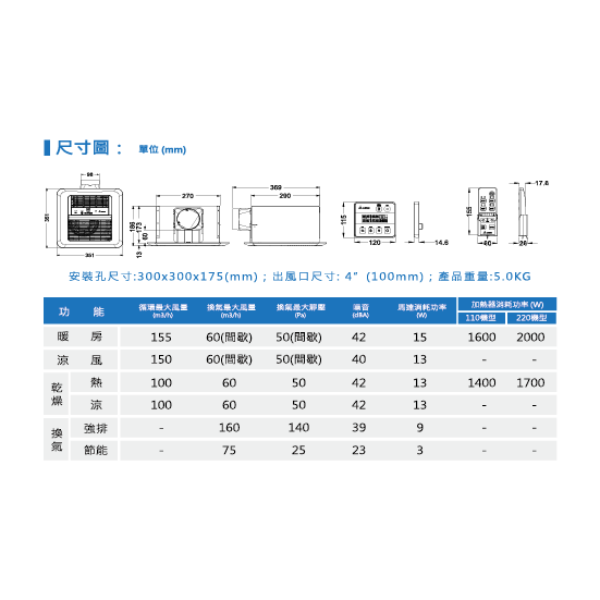 暖房15W/涼風15W/乾燥(熱/涼)13W/換氣強排9W節能3W